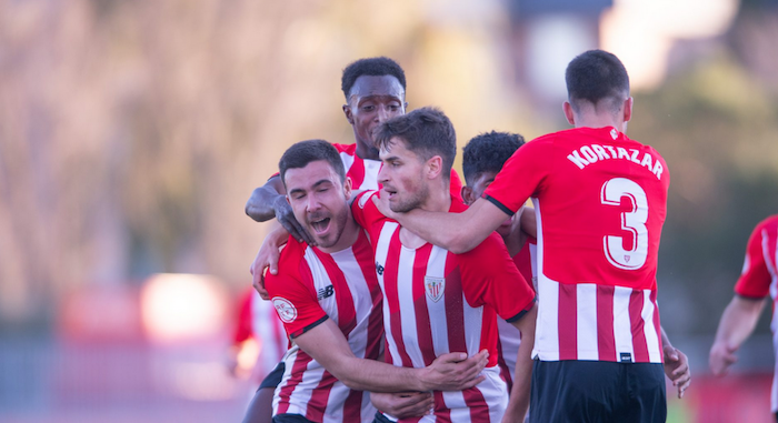 Jugadores del Bilbao Athletic celebran el gol de Beñat Prados ante el Rayo Majadahonda. (@AthleticClub)