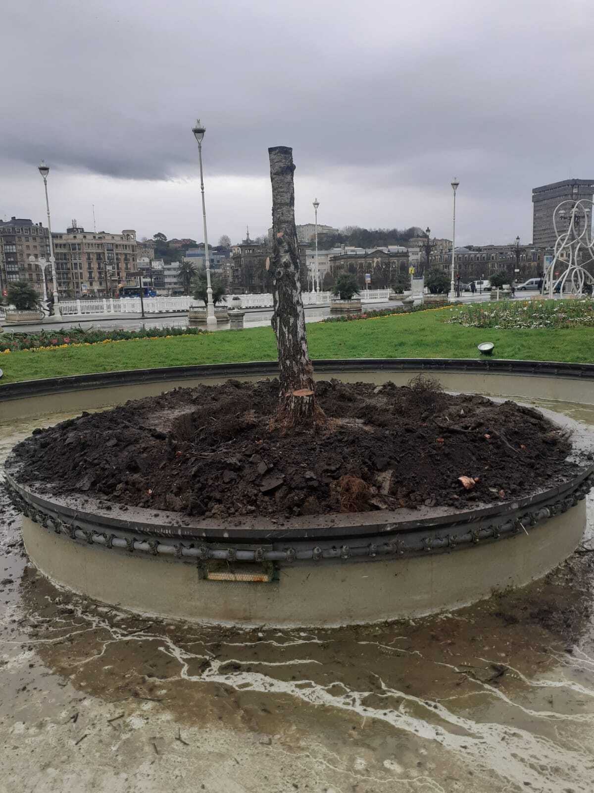 Respecto a la situación del abedul, ha subrayado que «fue plantado durante el proceso de ampliación del parking de Okendo» y «estaba desde hace tiempo completamente seco». Será sustituido por un cornejo.
