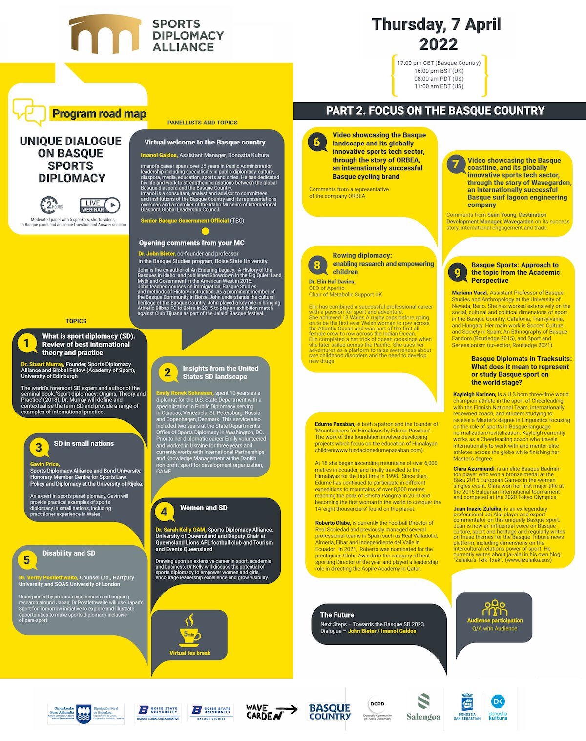 Donostia Kultura –Gipuzkoako Aldundiko Kirol eta Kultura sailaren laguntzaz eta Wavegarden, Salengoa eta Boiseko Unibertsitatearen kolaborazioarekin– eta Sports Alliance erakundearen arteko elkarlanaren emaitza da ostegun honetan, modu digitalean, antolatu den jardunaldia –esteka honetan eman daiteke izena, jada 150 pertsonatik gora apuntatu dira–. Kirol diplomazia izango du ardatz, lehendabizi nazioarte mailako testigantzak batuko dira eta ondoren, Euskal Herriaren nazioarteko posizionamendua ere aztertuko da zenbait euskal eragile eta kirolariekin. Horien artean egongo dira Edurne Pasaban alpinista, Clara Azurmendi badminton jokalaria, Juan Inazio Zulaika puntista ohia eta Roberto Olabe Realeko kirol zuzendaria.