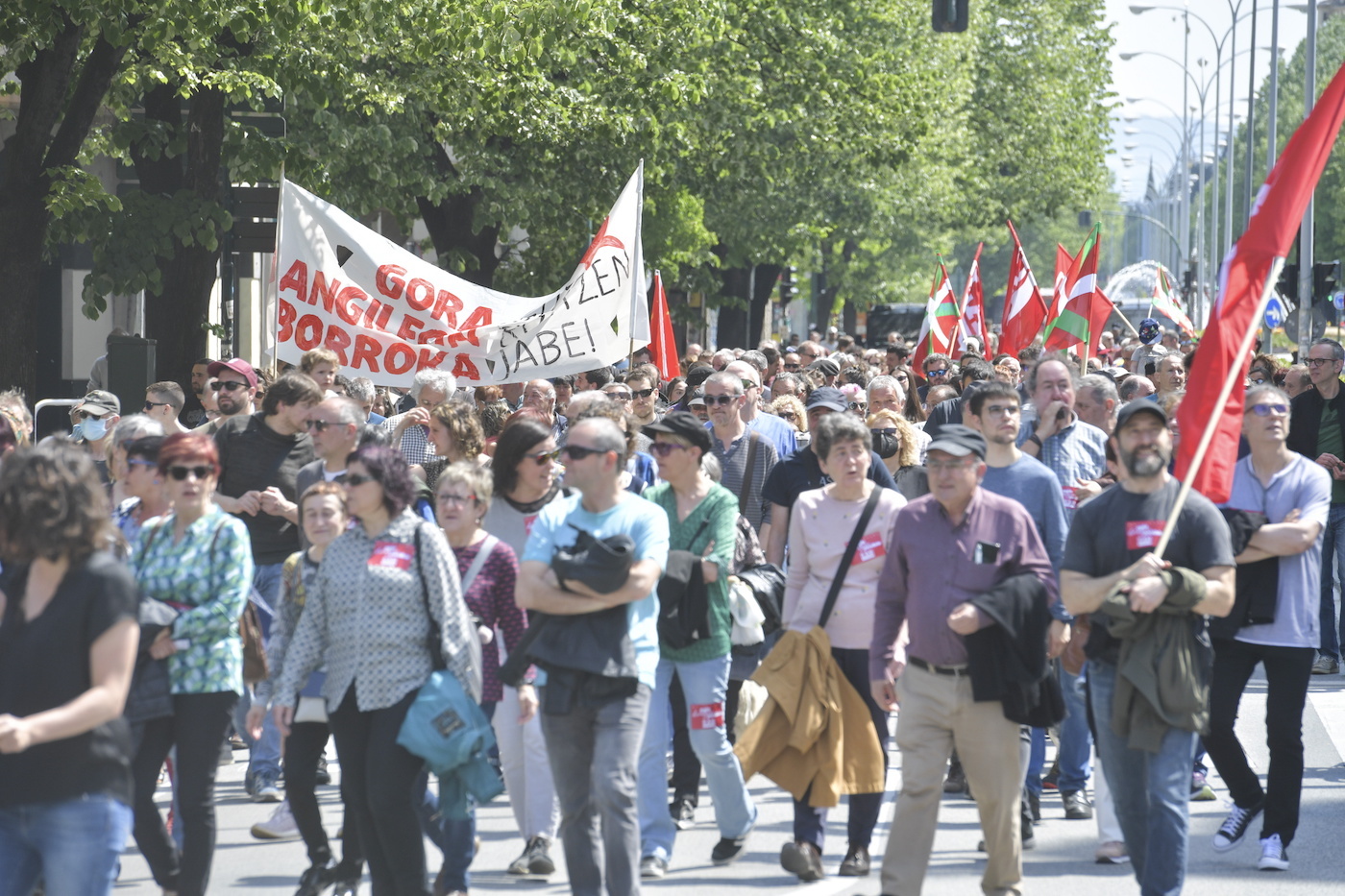 «Gora Maiatzaren Lehena», «Independentzia, sozialismoa», «Obrero despedido, patrón colgado» eta «Gora borroka feminista» oihuen artean, manifestazioak hiriburuko kale nagusietako batzuk zeharkatu ditu. Ikurrinak, Nafarroako banderak, sindikatuaren beraren banderak, gorriak eta moreak, pentsiodunak buru zituen mobilizazioari kolorea ematen diote.