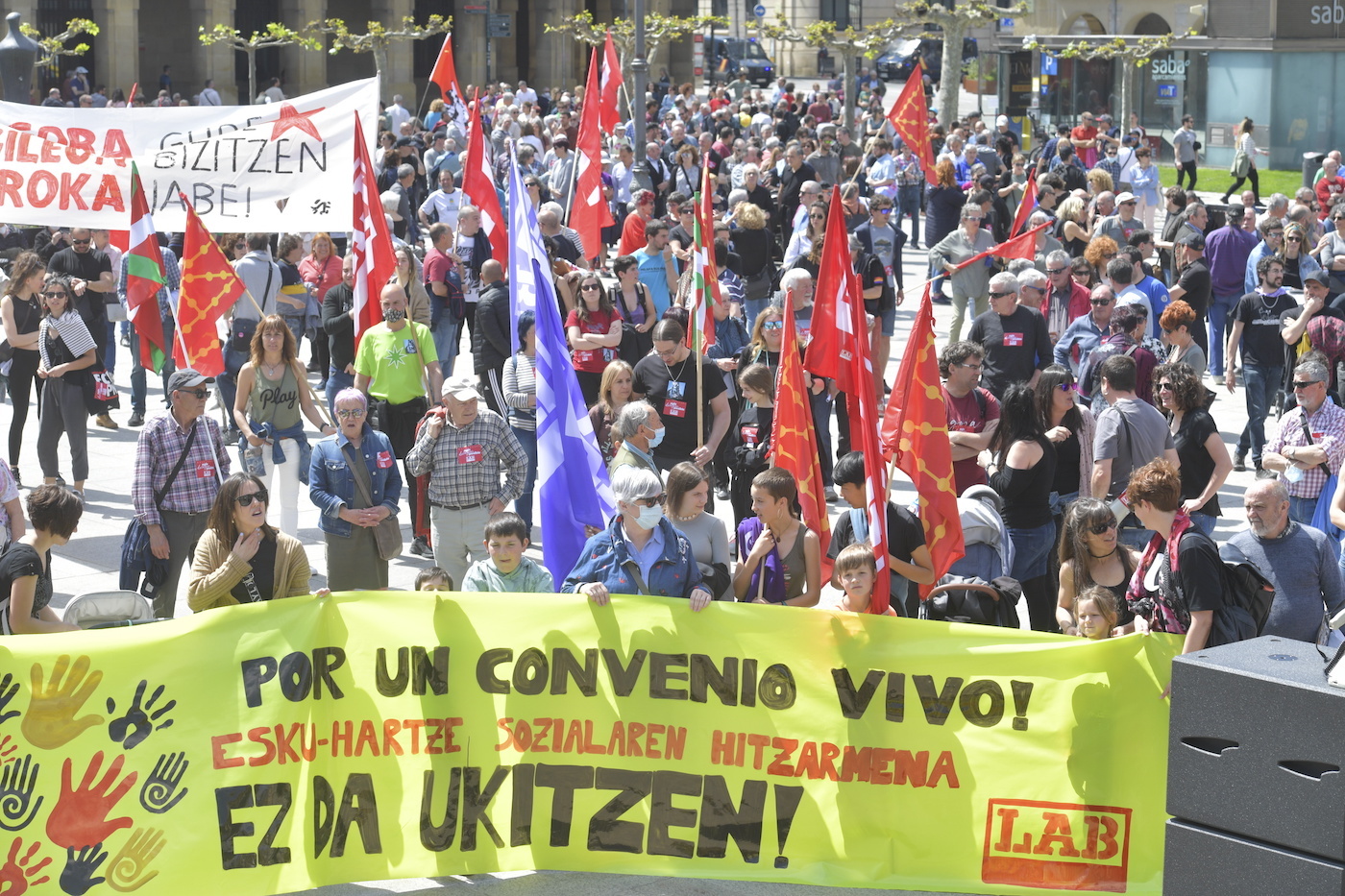 Plazara itzuliz, «Vergüenza me daría ser policía» eta «borroka da bide bakarra» oihuak eta, bertan, txalapartariak eta irrintziak, sindikatuko bozeramaileen hitzaldiaren aurretik. Internazionala euskaraz buruz ikasi dutenek ozen abestu dute munduko langileen ereserkia, eta, Euskal Herrira itzuliz, ‘Eusko Gudariak’ ere ez da falta izan. Jarraian, Alaia Martinek bertsoa: «Gaur eta beti langilea da herri honen zutabea...».