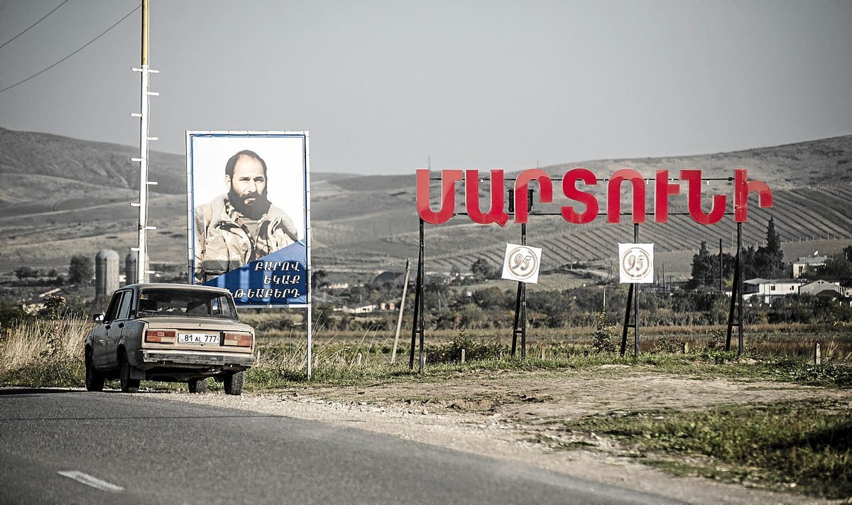 2020ko azaroaren 2a. Azerien bonben euri-jasa mardula da Nagorno Karabajen, baina Martuni herrian geldialdi labur bat egin nahi izan dugu. Zutik dirau bere erretratua herriko sarreran, baita bere omenezko estatua ere herriko plazan.