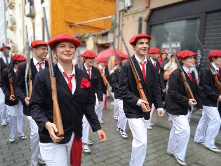 Hatxeroek zabaldu dute desfilea. Jarraian, danborrada, musika banda, zalditeria eta artilleria. ‘Alardean emakumeak’ oihua ederki zabaldu dute Irungo kaleetan barna.