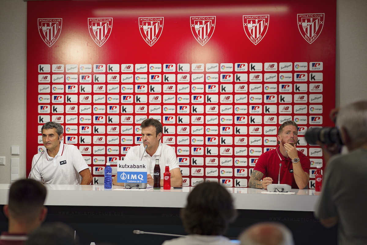 Valverde junto al presidente Jon Uriarte y el capitán Iker Muniain en una rueda de prensa ofrecida para marcar los objetivos de la presente temporada. (Aritz LOIOLA / FOKU)