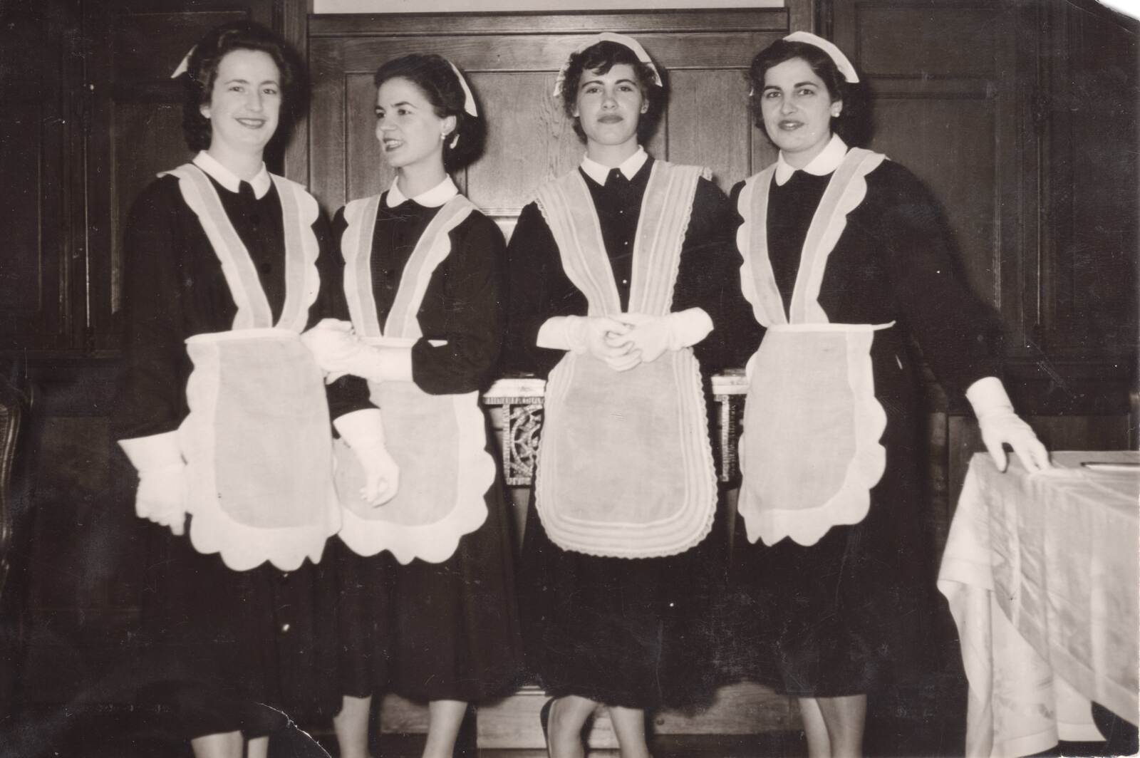 Pakita Burguete, ezkerretik lehenbizikoa, Ziburuko Elkano etxeko jantokian, bertze hiru neskatorekin batera, Nati Irazoki, Mari Paz Lazkanotegi eta Pakita Irazoki, denak beratarrak. (PAKITA IRAZOKIK UTZIA)