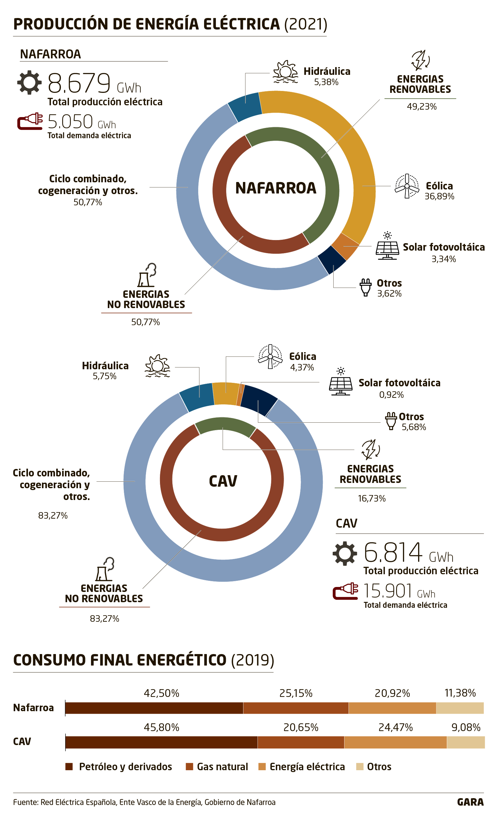 En 2021, Nafarroa produjo 4.273 GWh de electricidad de fuentes renovables, un 49% de su producción total. En Araba, Bizkaia y Gipuzkoa, se generaron con renovables 1.140 GWh de energía eléctrica, un 17% de la producida en toda la CAV.