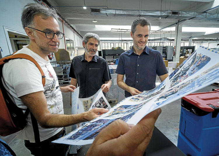 Komikiaren lehen frogak zain dituzte hiru egileek. Koloreari arreta jarri dio Joseviskyk, haren intentsitateari, bereziki. Balekoa da. Eta minutu batzuetara iritsi da unea. Orriak ateratzen hasi dira. Begiek diz-diz egiten diete hirurei. «Proiektua izatetik errealitatea izatera pasatu da», diote. Poztasuna.