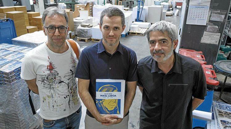 Ez da egunero suertatzen, bere sorkuntza inprimategian papereratzeko unea autore baten ondoan bertatik bertara bizitzeko aukera. Are gutxiago hiru egilerekin. Andoaingo Leitzaran Grafikak-en lantegira sartu eta tinta usainez blaitutako lan giroa aurkitu dugu. Durangoko Azokan argia ikusiko duten zenbait izenbururen orriak ikus daitezke, bakoitza bere piloan, azaleztatuak izateko zain. Iritsi berriei aurpegian nabari zaie inprimatze prozesuak pizten dien jakin-mina. Joseba Larratxe ‘Josevisky’, Harkaitz Cano eta Unai Iturriaga galderak egiten ari zaizkie langileei.