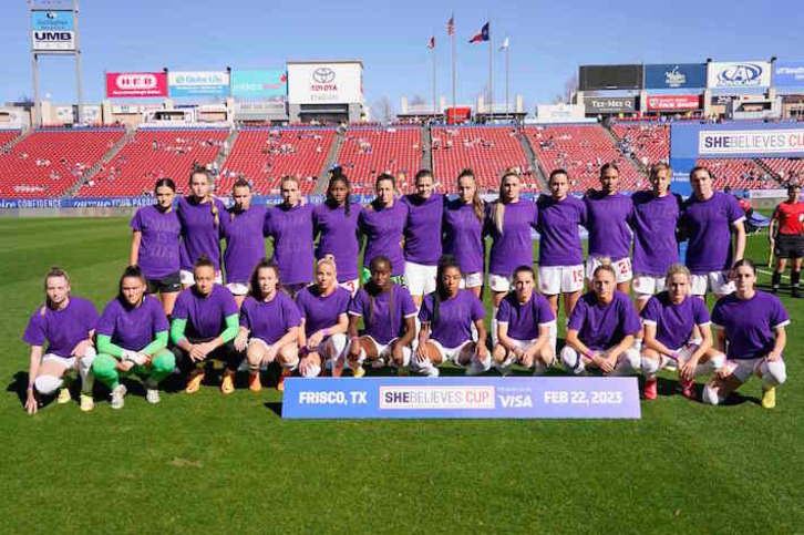 La selección canadiense, con el mensaje «Enough is enough» en las camisetas, posa antes de un amistoso con Japón en la última She Believes Cup.