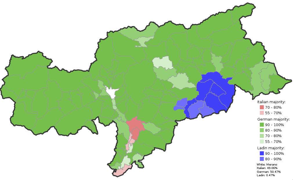 La frontera desde el río Piave subía hasta el puerto del Brennero, al norte, asimilando una población que, según las estadísticas de la época, hablaba alemán en el 84% de los casos en la provincia de Bolzano. Una Bolzano que, por supuesto, tenía nombre alemán, Bozen, y que siempre ha sido mucho mas germanófila que su vecina, la provincia de Trento.
