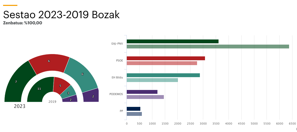 En Sestao, los jeltzales han perdido la mayoría absoluta, pasando de 11 a 7 concejales. El PSE ha sido la segunda fuerza más votada, aunque ha empatado a concejales con EH Bildu, 6 cada uno. Elkarrekin Podemos ha logrado dos. Habrá que ver si el PSOE deje que gobierne el PNV o acepta el posible apoyo de las fuerzas de izquierdas para lograr la alcaldía.