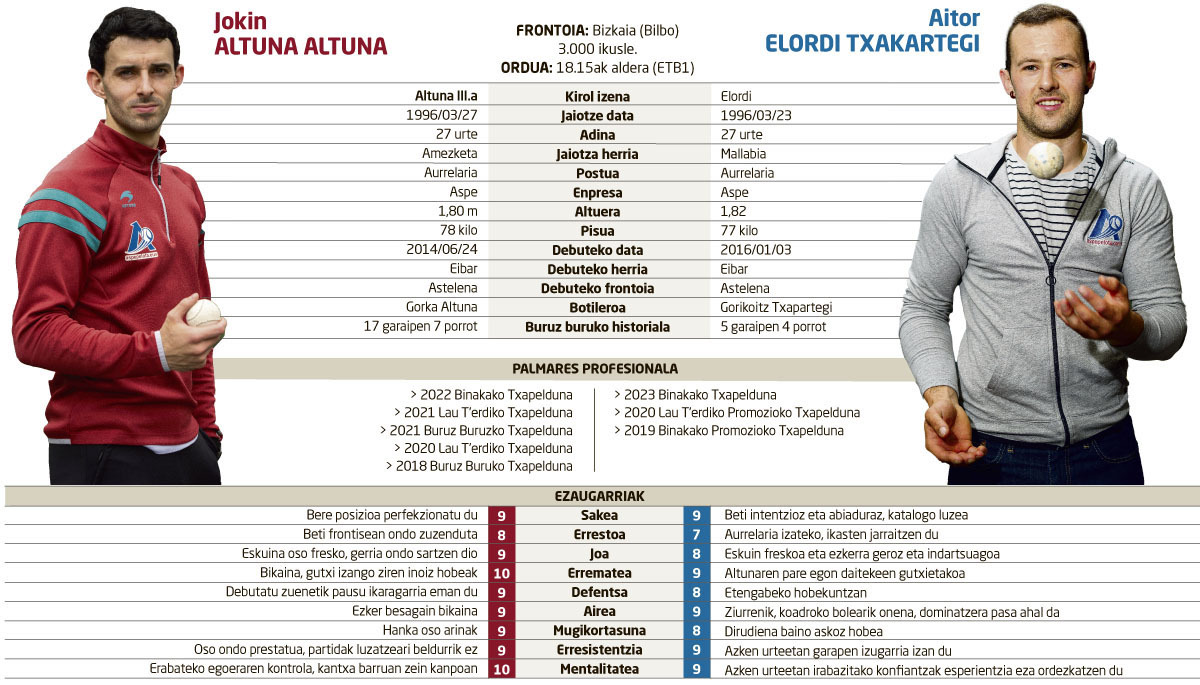 Pilotaren gailurraren atarian, igande arratsaldean Bilboko Bizkaia pilotalekuan gurutzatuko diren Aitor Elordiren (Mallabia 1996/03/23) eta Jokin Altunaren (Amezketa 1996/03/27) jaiotza daten artean lau eguneko aldea baino ez dago. Kinta berekoak eta lagun handiak izanagatik ere, pilotaren bi errealitate oso desberdinetatik heldutako bi pilotari izango dira urteko zitarik garrantzitsuenean elkarren aurka arituko direnak, goraino bete gabe –152 sarrera inguru saltzeke zeuden– giro ederrean jokatuko den finalean.