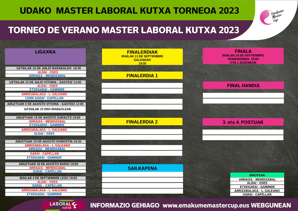 Txapelketari dagokionez, irailaren 29an Hondarribiko Jostaldi pilotalekuan jokatuko den finalaren aurretik, torneoak Euskal Herriko kantxarik garrantzitsuenetako batzuk bisitatuko ditu: Barakaldo, Gasteiz zita bikoitzarekin –uztailaren 25a eta abuztuaren 6a–, Zarautz (abuztuaren 18a), Donostia (abuztuaren 19a), Bakio (abuztuaren 30a), Lezo (irailaren 4a) eta finalerdiak hartuko dituen Galdakao (irailaren 13an).