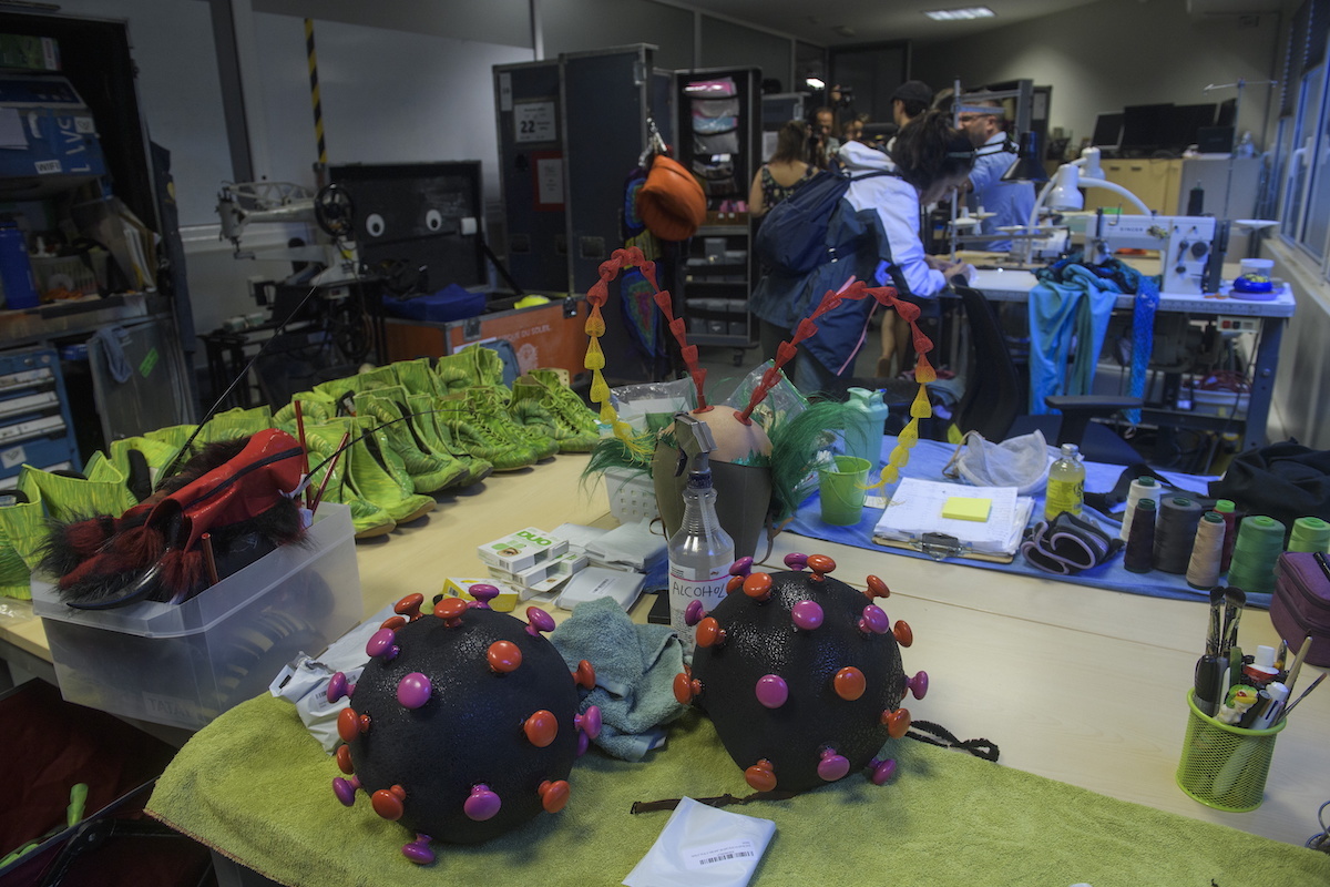 Familiarekin bidaiatzen duten lau jostunek konpontzen dituzte entsegu eta emanaldietan jantziek izaten dituzten urradurak eta izerdiak eragindako higadura. Garbigailu erraldoiekin bidaiatzen dute, oinetako guztiak beraiek egindakoak dira, makillaje denak bezala, Cirque de Soleil konpainiako artista orok dakielako makillatzen, hori nahitaez ikasi beharra duelako.