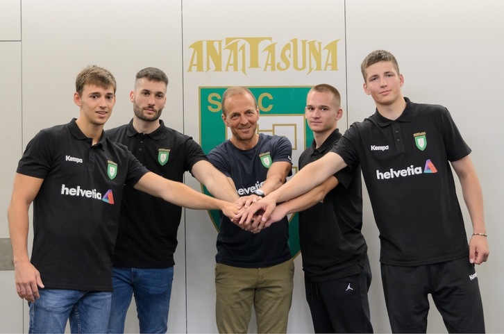 Helvetia Anaitasuna ha presentado este viernes por la mañana a los cuatro nuevos fichajes que reforzarán al equipo en la temporada 2023-2024. Son Aitor Albizu, Adrián Ortiz, Niko Martinovic y Roberts Rancans, cuatro jóvenes jugadores que personifican la apuesta por la juventud del equipo iruindarra en su nuevo proyecto, en el que ya no estárán emblemas del club como Carlos Chocarro.