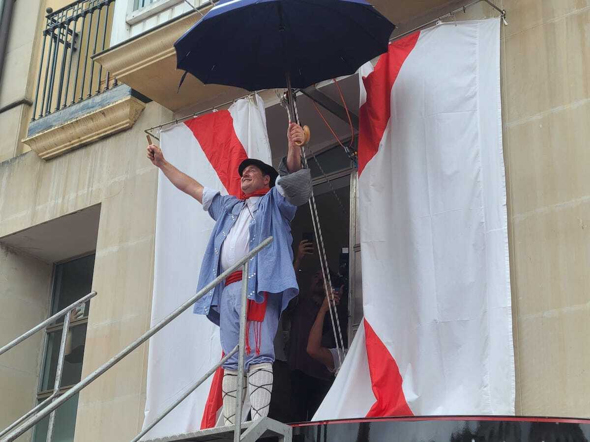 Antes de su aparición, nada más dar las 18.00, a una con el chupinazo y las campanadas, la figura de Celedón ha cruzado por encima de la multitud, que no dejaba de saltar para celebrar lo que se viene estos cinco días y medio. El paseíllo por el cable, unos cinco minutos, se ha hecho esta vez quizás más largo por la expectación que se palpaba para recibir –y despedir– al de carne y hueso.