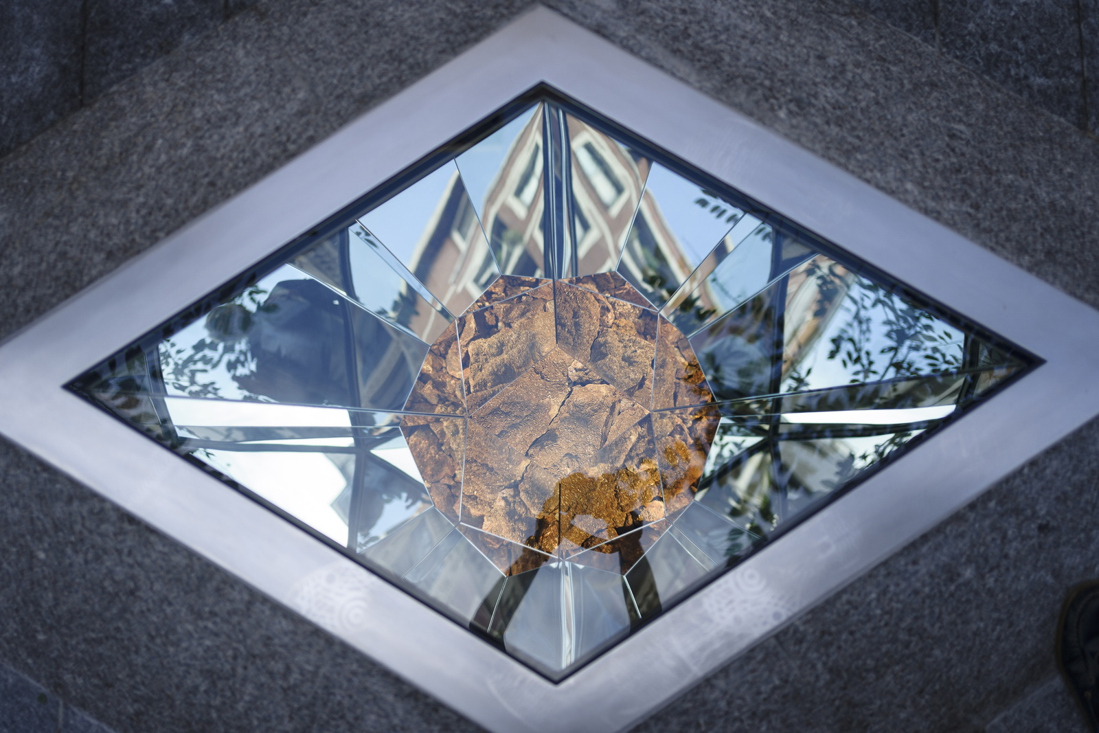 El artista, que visitó Bilbo hace tres años, a escasas semanas de declararse la pandemia, ha explicado que el peatón, mirando hacia abajo, puede ver en la obra inaugurada diferentes minerales, que «están en el subsuelo y que son los que han servido para construir la ciudad».