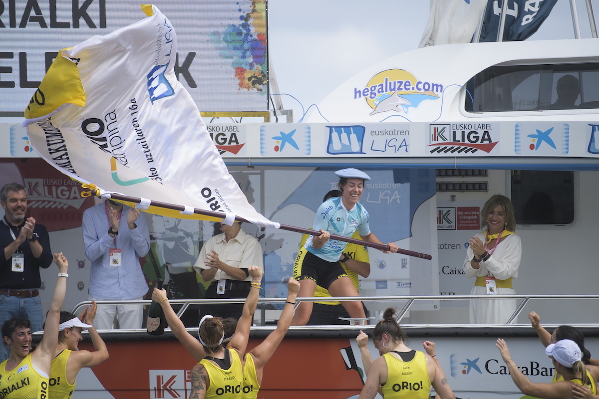 Nadeth Agirre aurtengo Orioko estropadako bandera astintzen, taldekideen aurrean. (Jon URBE | FOKU)