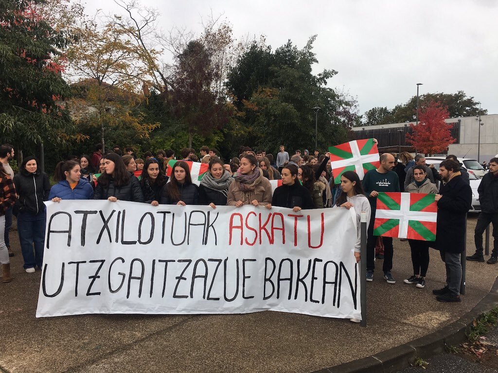 Lau atxiloketa horiek salatzeko Baionako Bernat Etxepare lizeoaren sarreran elkarretaratzea egin dute, gaur 10.30ean, bertako langile den Filipe Laskarai eta bera bezala atxilotuta dauden beste hiru herritarrak lehenbailehen aske uztea galdetzeko.