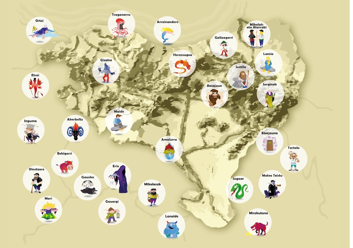 Liburuaren bigarren orrialdean Euskal Herriko mapa dago, eta bertan pertsonaia bakoitzaren ilustrazioa topa daiteke gutxi gorabeherako bere bizitokiaren gainean; leku finkorik ez dutenak eta batetik bestera ibiltzen direnak, maparen inguruan kokatu dituzte.