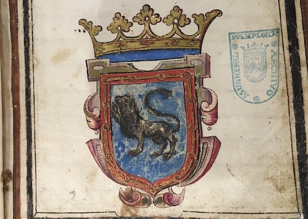 Teniendo en cuenta esta afición y los vínculos del león con la monarquía en general, no era de extrañar que ese felino dominara la imagen del escudo de Iruñea. Sobre este emblema, en el Privilegio de la Unión se establece que el fondo debe ser de color azul, rodeado por una banda con la armas de Nafarroa. En el centro debe aparecer un león pasante de color plata, con la lengua y las garras de color rojo. Y sobre el animal tiene que figurar una corona real de oro, en señal de que los soberanos de Nafarroa «suelen y deben ser coronados en la iglesia catedral de Santa María» de Iruñea.
