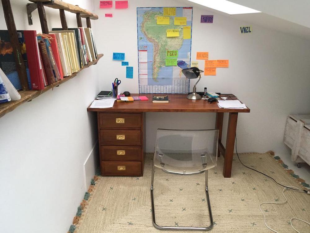 Horrela lortu nuen eskritorioa, idazletzan hasteko parapetoa. 2021eko udazkena zen, irratian eszedentzia hartu eta erredakziokoak despeditu berri nituen. Nire idazmahai flamante hori etxeko txapitulara igo, eta hormaren kontra jarri nuen. Parean Hego Amerikako mapa erraldoi bat zintzilikatu nuen, eta post-itez betetzen hasi nintzen. Ezer baino lehen idazle plantak egin nituela, alegia. Fake it till you make it.