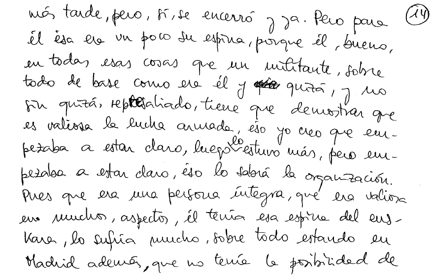 «No he conocido a nadie más claro en la clandestinidad. Él era clarísimo; lo que no había que decir, ni sospechabas que lo sabía. Ya sabes, en los momentos de la clandestinidad es muy frecuente que la gente haga como que sabe cosas que no puede decir, pero con ‘Argala’ lo que no había que decir no había que decirlo. Y esa era la gran seguridad que uno tenía con él».