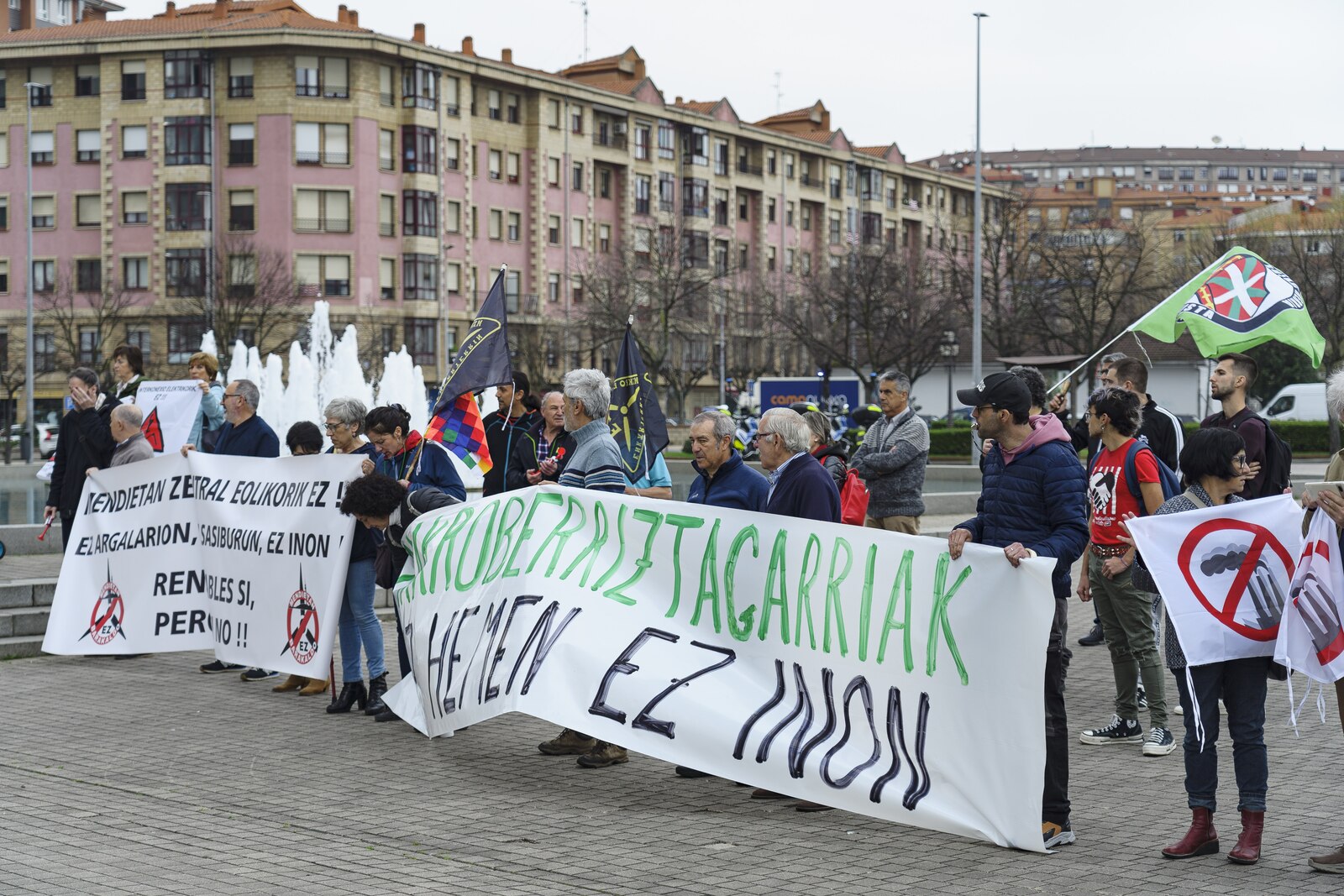 En la entrada del recinto se han concentrado miembros de la plataforma Euskal Herria Bizirik, frente a quienes «buscan alimentar esta nueva burbuja económica maquillada de verde». Por ello, han solicitado «la inmediata suspensión de autorizaciones para instalar este tipo de proyectos, y de la tramitación actual del nuevo proyecto de PTS de Energías Renovables, por sus negativos impactos sobre la naturaleza, la economía, la historia y la cultura; porque hipoteca y vende al mejor postor nuestro territorio y por ser objeto de un amplio rechazo».