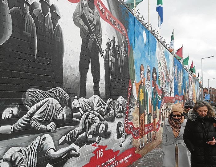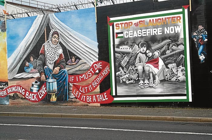 Jende andana igarotzen da egunero Belfasteko mural horien aurretik. Helburuetako bat da, hain zuzen, palestinarren aurkako sarraskia munduaren aurrera eramatea, bertako artistek igorritako irudi eta materialak horma luze horretan margotuz.