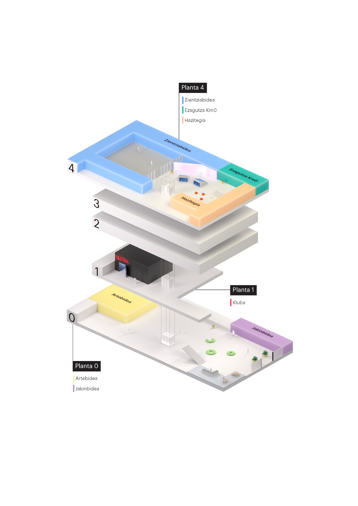 Beheko solairuan ‘Artebidea’ eta ‘Jakinbidea’ izeneko espazioak egongo dira «jakin mina praktikatzea xede duen hipermedia espazioa eta erakusketa aretoa, egun arte ‘Artegunea’ izenez ezagutu dena». Lehenengo solairuan, ‘Kluba’ ikuskizun aretoa egongo da, egun ere badagoena.