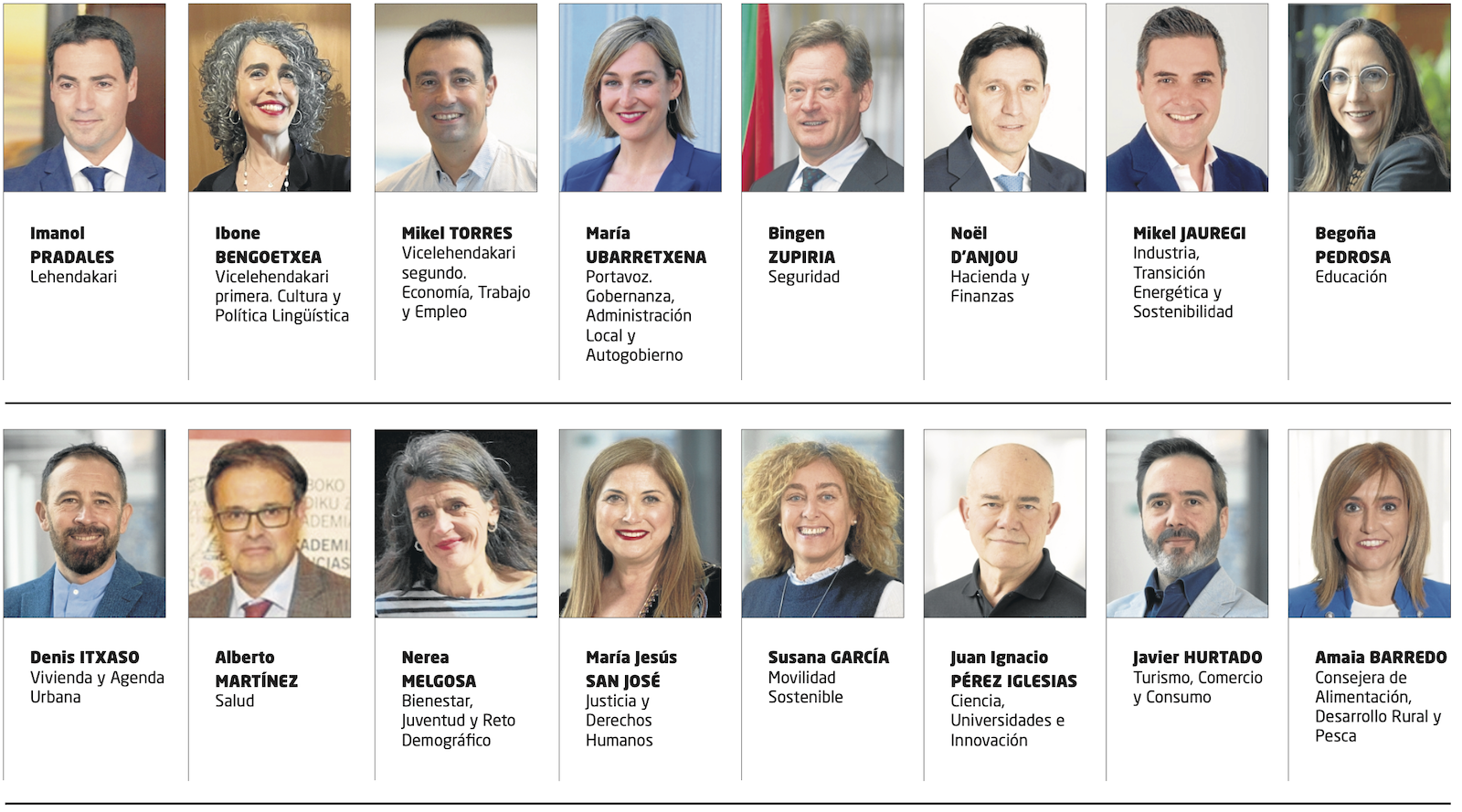 Diez miembros del PNV y cinco del PSE. Imanol Pradales ha formado el Gobierno autonómico más amplio de la historia de la CAV. Tanto que sus dieciséis integrantes no entran en los catorce escaños reservados para el Ejecutivo en la primera fila del salón de plenos del Parlamento.