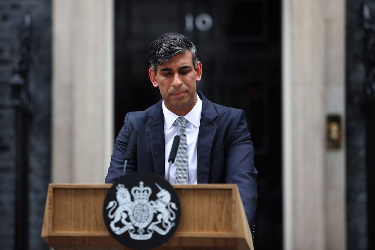 El primer ministro saliente, Rishi Sunak, ha anunciado este viernes que abandonará el liderazgo del Partido Conservador tras la debacle de la formación. Así lo ha hecho saber Sunak durante su discurso de dimisión a la puerta del número 10 de Downing Street, antes de dirigirse al palacio de Buckingham para hacerla efectiva ante el rey Carlos.