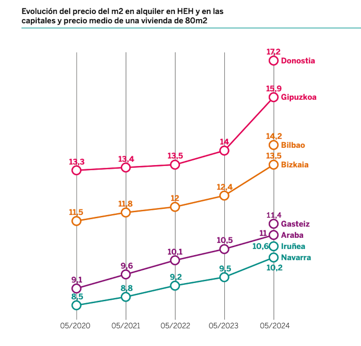 Según el Observatorio Vasco de la Vivienda, el 81% de las personas que viven de alquiler lo hacen porque no pueden permitirse una vivienda o están de forma temporal hasta que puedan hacerlo. Además, el precio de los alquileres sigue encareciéndose en todo Hego Euskal Herria. Por ejemplo, una vivienda de 80 m² cuesta una media de 1.376 euros mensuales en Donostia, 1.136 en Bilbo, 912 en Gasteiz y 848 en Iruñea.