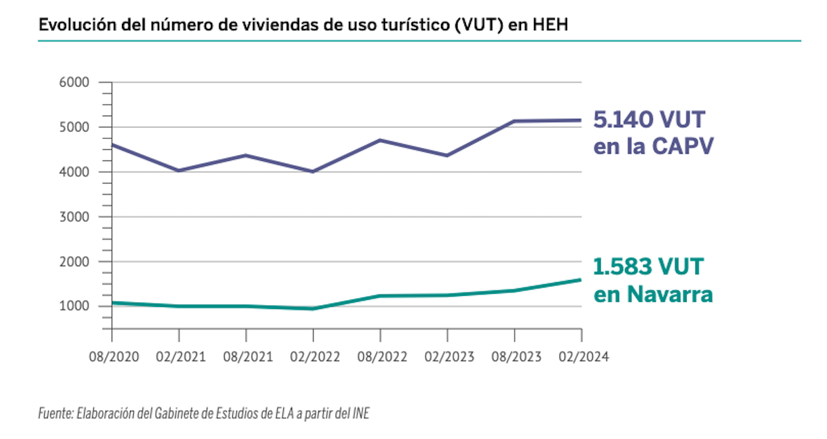 Otra de las críticas que hace el sindicato es que la Ley renuncia a regular las viviendas turísticas, «lo que está conllevando un aumento de las mismas, agravando el problema del acceso a la vivienda». De hecho, las viviendas turísticas en Hego Euskal Herria han aumentado un 30% desde 2022 (hay 5.140 en la CAV y 1.583 en Nafarroa).