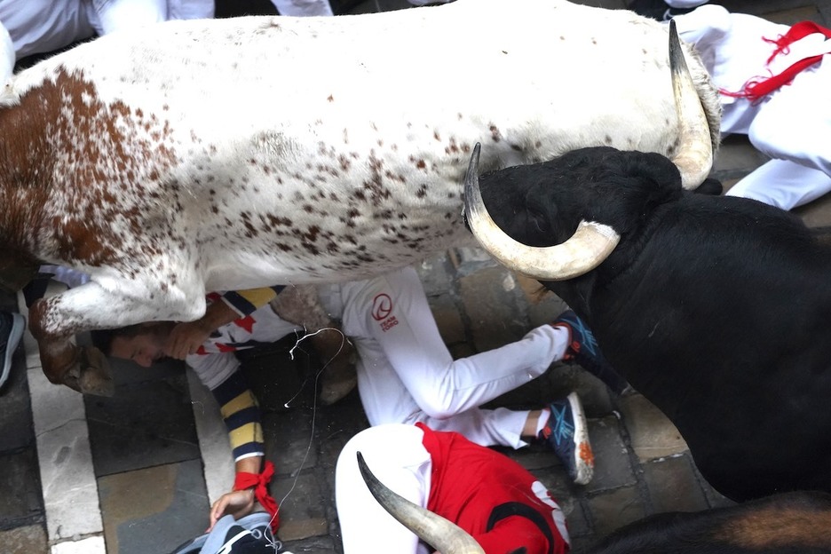 En la bajada al callejón se han producido dos situaciones casi idénticas. Los toros se han echado a la derecha por la inercia y se han topado con dos grupos de mozos que habían chocado y no tenían espacio físico para retirarse.