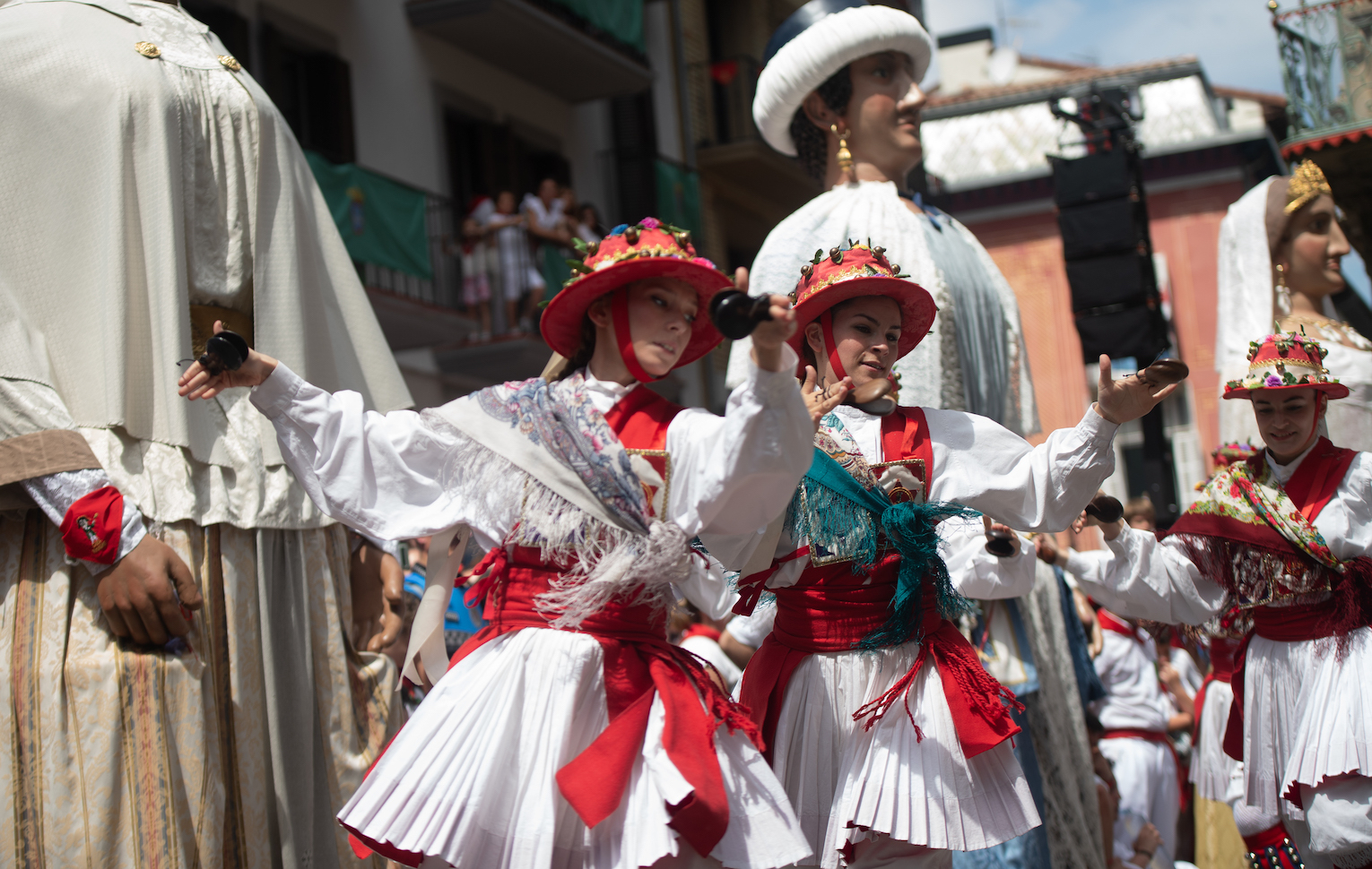 13.00ak dira eta termometroak 29 gradu markatzen ditu. Plaza txuri-gorri dago, txupinazoaren antzera, baina kasu honetan txikiak dira nagusi eta zortzi erraldoi daude erdian, munduko lau lurralderen erakusgarri: Europa, Asia, Afrika eta Amerika. Balkoietan ikurriñak eta bandera palestinarrak ageri dira, zerua urdin eta berotik babesteko ura, abanikoak eta txapelak. Ordubete inguruko ekitaldia izan da, tenperatura goraka, baina ez da inor mugitu, edo ez dio inork horregatik dantza eta salto egiteari utzi.