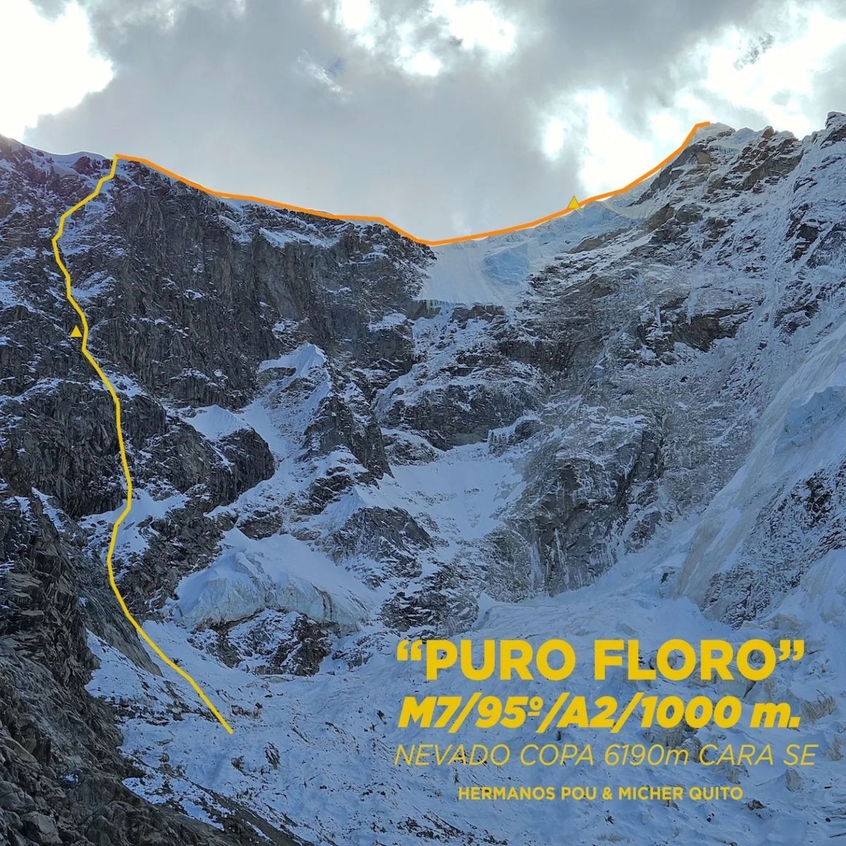 Hirukoteak Copa mendiaren (6.188 m) hego-ekialdeko isuria aukeratu zuen bigarren helburu nagusia egiteko. Marra berriak lau eguneko lan eskerga eskatu zien. Emaitza: ‘Puro Floro’. Mila metroko ibilbide horretan zailtasun tekniko oso gogorrak gainditu behar izan zituzten: M7, 95° eta A2. Mistoa, izotza eta artifizial zaila jarduera hori biribildu ahal izateko.