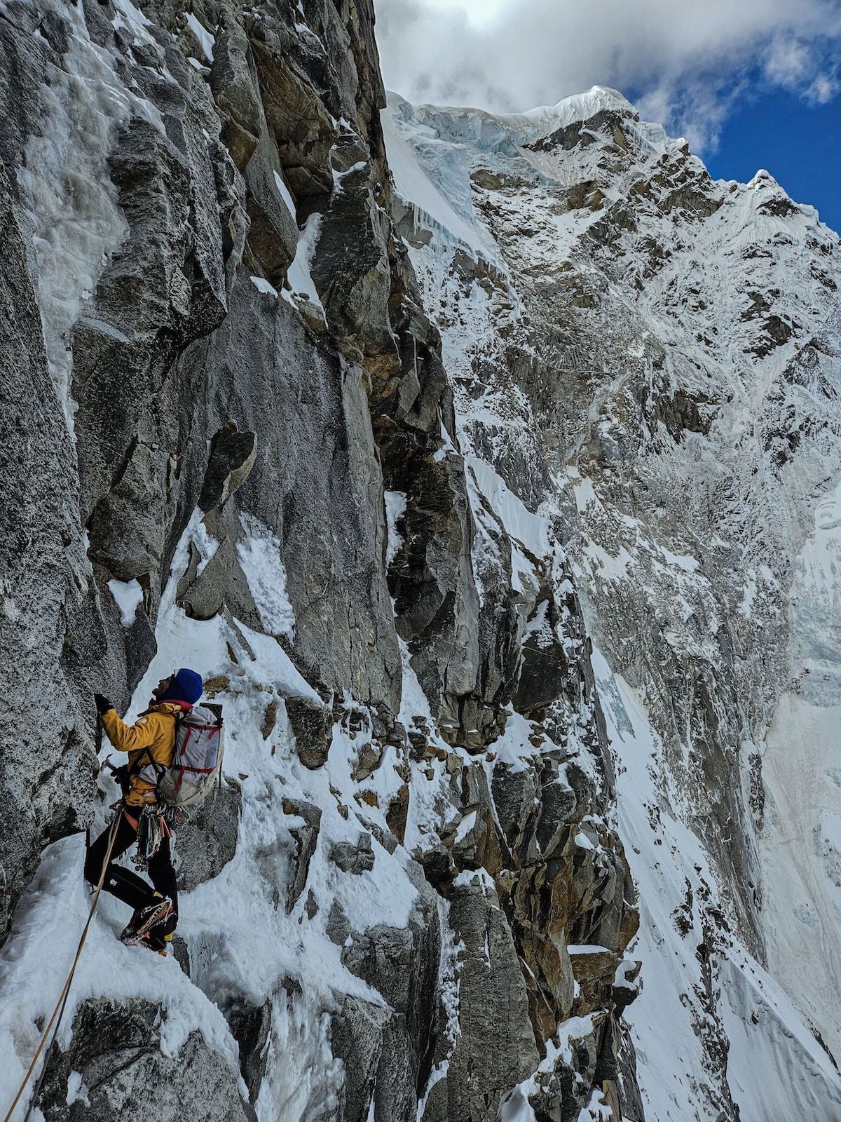 Goizeko 4.20an hasi zen mugimendua. Bi ordu geroago lehen zailtasun teknikoen aurrean jarri ziren: «Egunsentiarekin batera, mila metroko horma bat zain genuen. Arroka, izotza eta elurra. Lehen 200 metroak erritmo oso onean igo genituen; elurrezko aldats samurrak ziren. Baina puntu horretatik aurrera benetako zailtasun teknikoak iritsi ziren. Mistoko sekzio zail batek erritmoa mantsotu zigun. Tarte horiek gogorrak ziren, eta erori pixka bat ere bazuten».