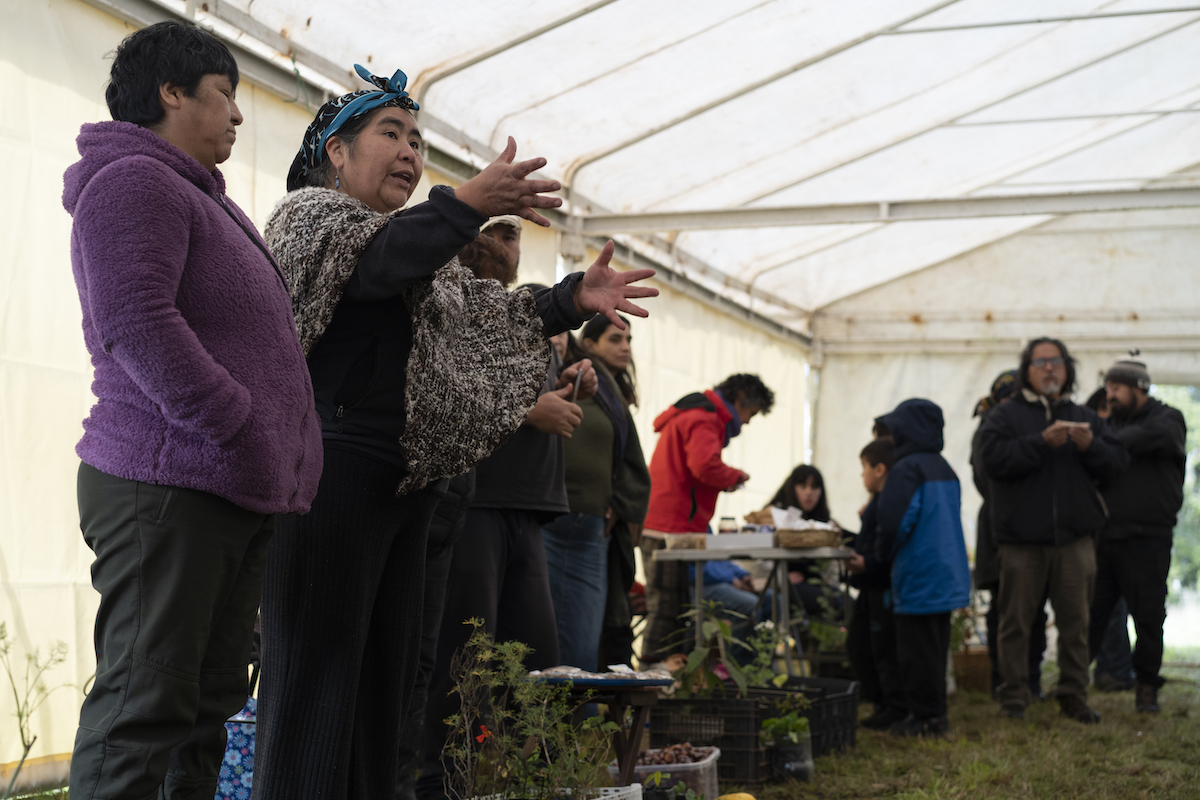 Bajo una carpa blanca que protege de la lluvia, unas 40 personas, incluidos dos pequeños grupos de escolares infantiles, explican quiénes son, por qué acuden y qué semillas, plantas o flores traen para intercambiar. Algunas personas hablan en mapudungu, otras en castellano. No falta el mate, tampoco el café y el té, y hay tortas de trigo, castañas y piñones enormes. María Elsa trae laurel, romero, menta y un orégano que «desde siempre» está en manos de su familia, y cultiva unos hongos que, cree, apenas conoce la comunidad mapuche. Por su parte, Blanca muestra flores, perejil, zanahorias blancas y espinacas rojas. Otras personas traen rábanos, tomates o amapolas.