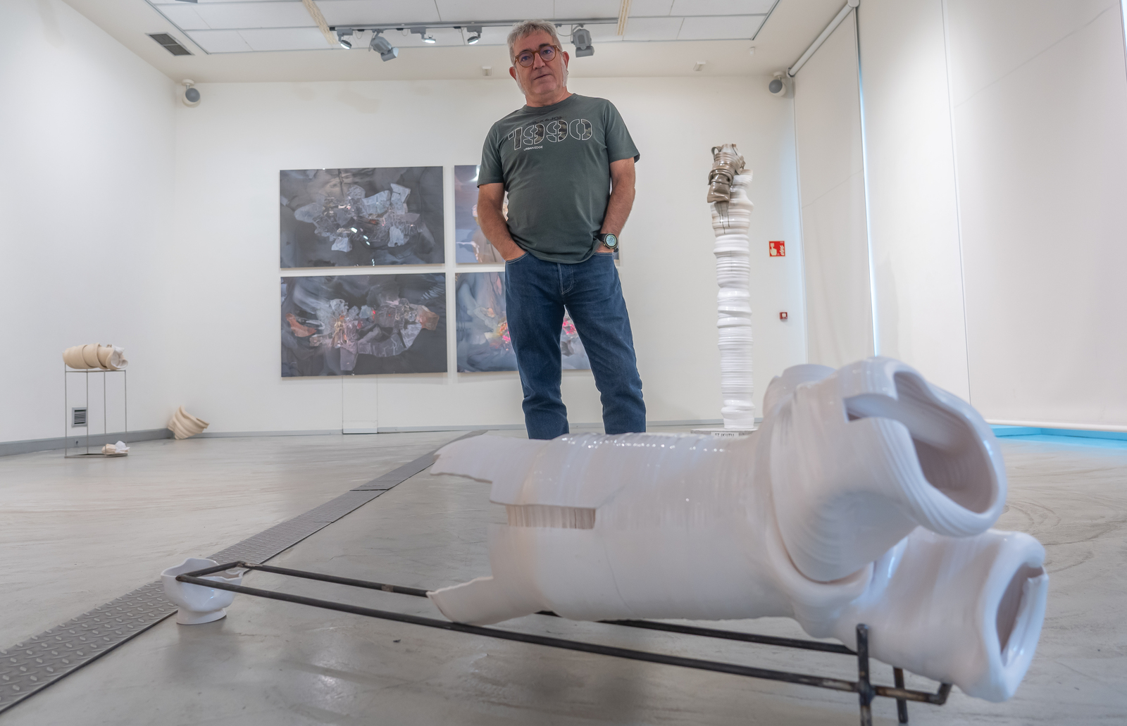 Diziplinen elkar eraginaz gain, bada bigarren hartu-emana. Sortzailearen eta honek eskuetan duen materialaren artekoa. «Urte askotako esperientzia duzunean bion arteko haria sortzen da. Batzuetan nire aginduak betetzen ditu materialak edo‘nik horrela jolasten dut’, esaten dit, eta nik onartu egiten dut. Bion arteko elkarrizketa sortzen da. Gustatzen zait buztinak berak erabakitzea non erori. Ez dut behartu nahi. Teknika menperatzen duzunean obra berez sortzen da», zehaztu du.