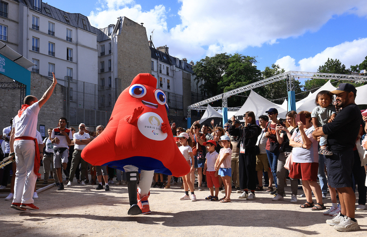 La mascota de los Juegos de París Phryge baila en las Arenas de Lutecia, en la capital gala. (Masaki FURUMAYA | AFP)