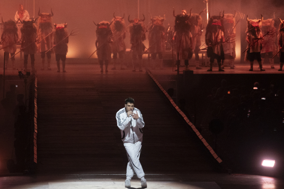 Los diferentes espacios escénicos (por encima del escenario principal se levantaba otro) fueron alternándose dinámicamente entre sorprendentes efectos y juegos de luces y acogiendo en las canciones posteriores a muchos de los protagonistas: seres mitológicos –como el interpretado por el actor Javier Botet−, bailarines −Kukai Dantza−, colaboraciones musicales −Neomak, Marala...−)...