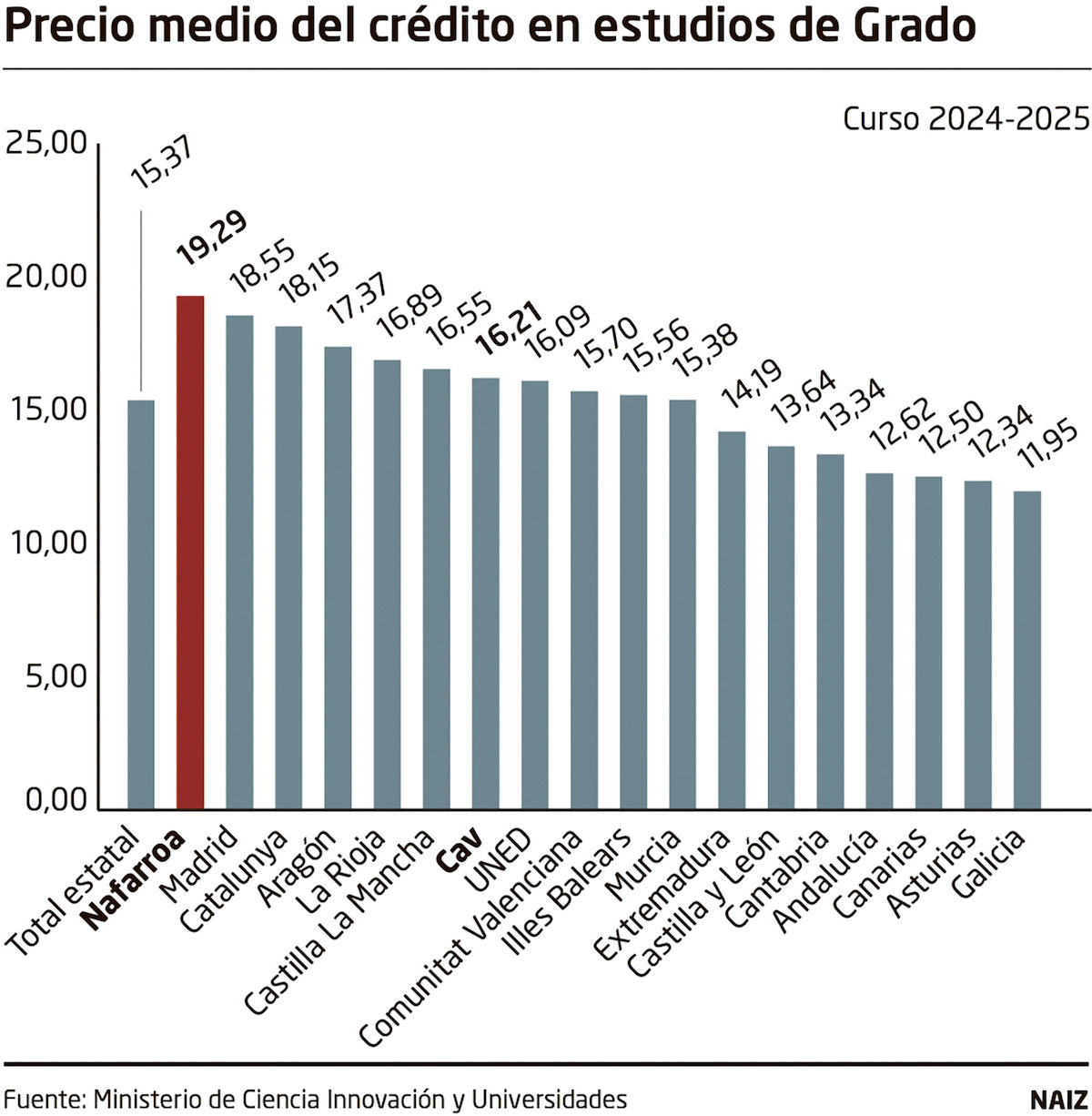 Idéntica situación ocurre en lo que se refiere a las titulaciones de Másteres habilitantes o vinculados a una profesión regulada. En el herrialde navarro supone 20,24 euros en el curso 2024-2025 (era de 21,38 en el anterior), por encima del resto de comunidades autónomas del Estado español. Por su parte, en la CAV, el precio se sitúa en 16,09 euros, en la undécima posición.