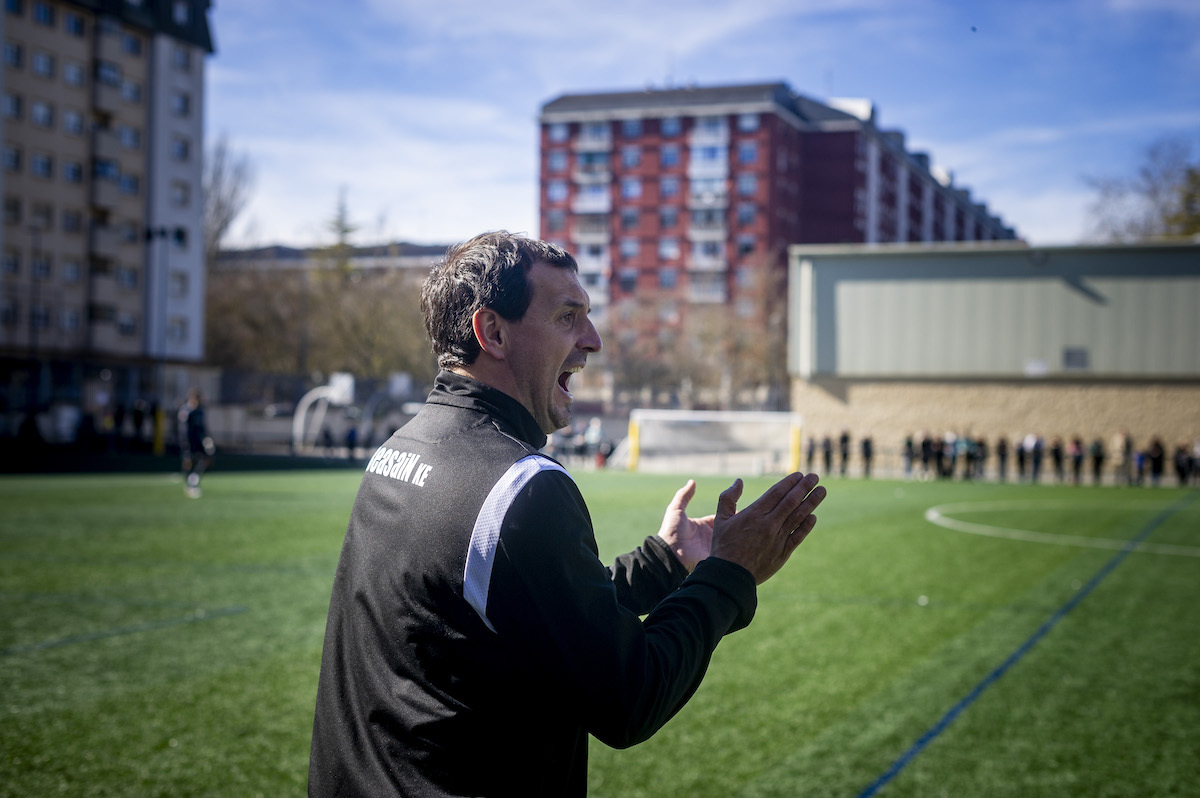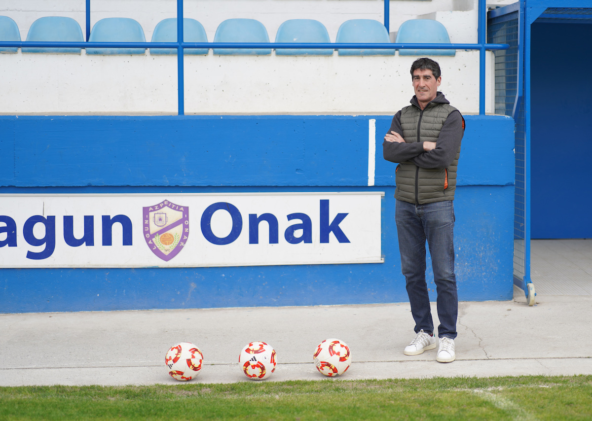 Eguzkiñe Peña futbolari ohia eta orain entrenatzailea, Azpeitiko futbol zelaian. (Andoni CANELLADA | FOKU)