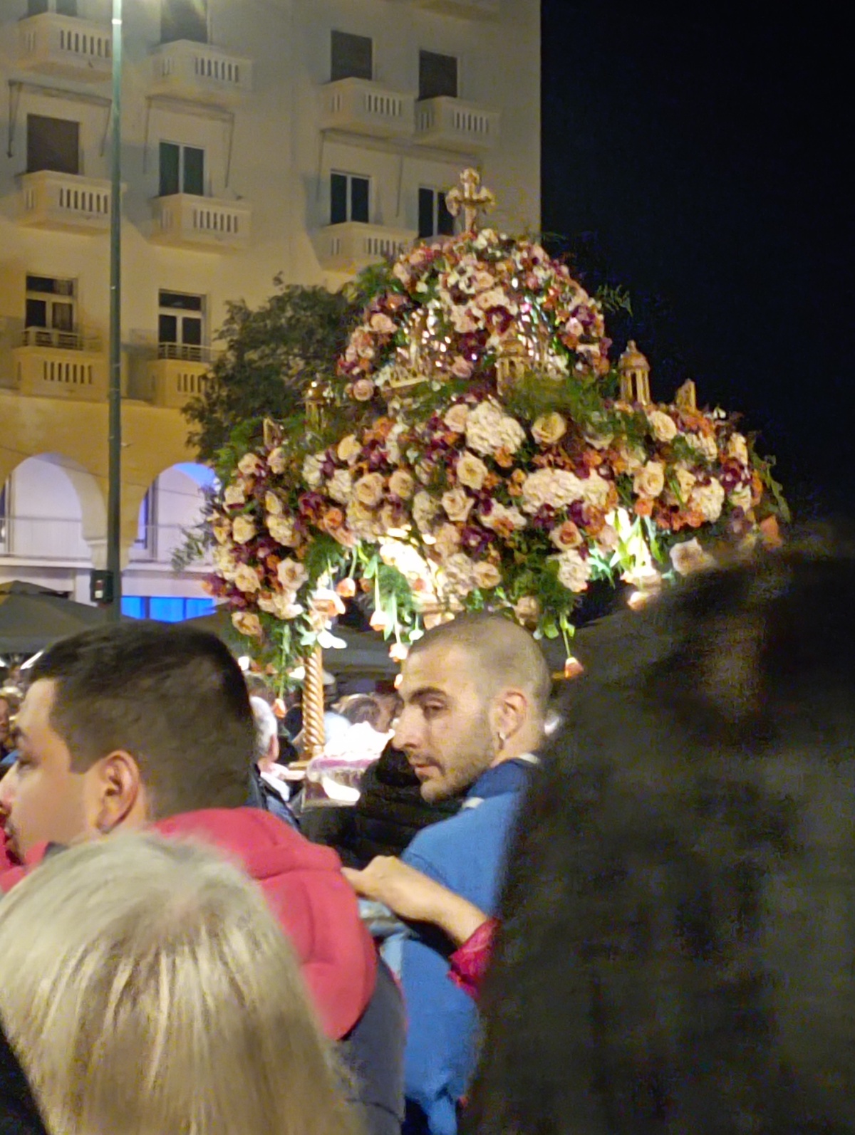 Telebista kamerek zuzenean erakusten dute prozesioa eta terrazetan afaltzen ari den jendeak mokadua, tragoa eta errezoa tartekatzen ditu, gorputza eta izpiritua gosez hilko ez badira.