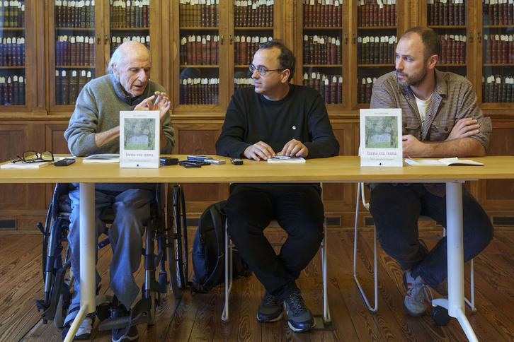 Jose Angel Irigaray, Jon Gerediaga eta Lander Majuelo, Gerediagaren ‘Izena eta izana’ liburuaren aurkezpenean. (Jon URBE | FOKU)