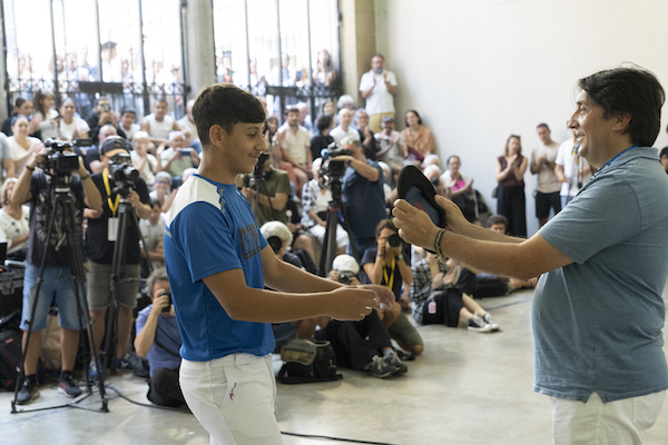 El frontón de la Mañueta, en Alde Zaharra de Iruñea, ha congregado a un gran número de personas para presenciar el que podría ser uno de los actos más emotivos organizados en la edición del festival de Flamenco on Fire de este año. Periodistas, fotógrafos y espectadores se han agolpado en la entrada, en busca del mejor sitio, frente a dos sillas en las que esperaban cuatro txapelas.