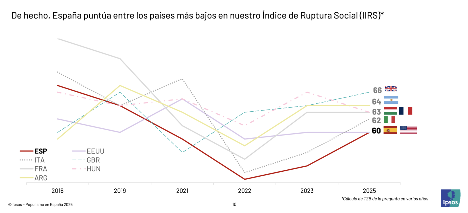Ipsos elabora un Indice de Sociedad Rota en el cual se tienen en cuenta varias respuestas de los encuestados relativas a la brecha entre élites y ciudadanía y la confianza en las instituciones. En el caso del Estado español, ese índice registra 60 puntos (en Reino Unido es 68, en Argentina 64 y en Francia 63). «Es bastante alto y muestra que la sociedad española tiene de las confianzas más bajas en las instituciones de toda Europa. Es algo estructural en la cultura política. Que vean a la política como principal problema es un fenómeno más reciente, del último lustro, hay saturación».