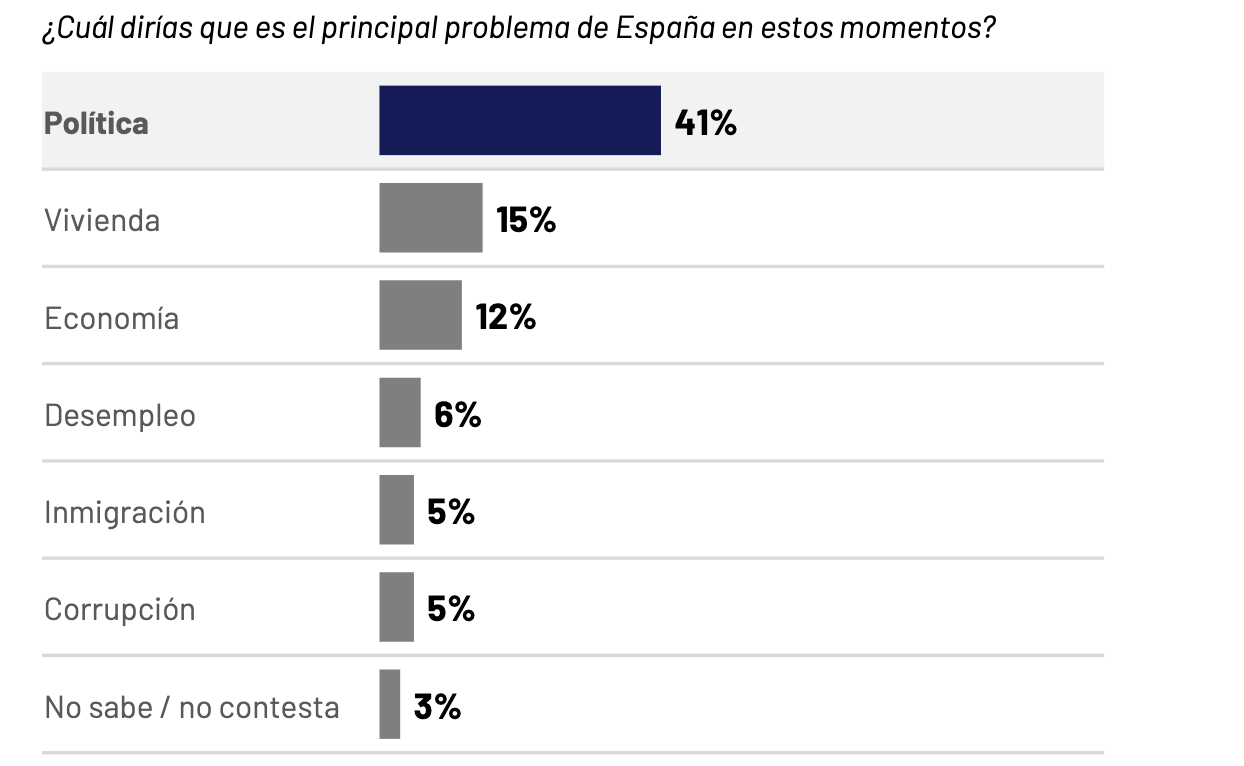 El informe, llamado ‘Populismo en España 2025’, señala que el 45% opina que la dirigencia política es el principal problema, seguido por la vivienda (15%) y la economía (12%). La desafección política se hace evidente con algunas respuestas: el 72% cree que los dirigentes «no se preocupan» por la gente común, y el 68% responde que «los expertos no entienden la vida de la gente común». Un porcentaje similar expresa «desconfianza» en los medios de comunicación tradicionales.