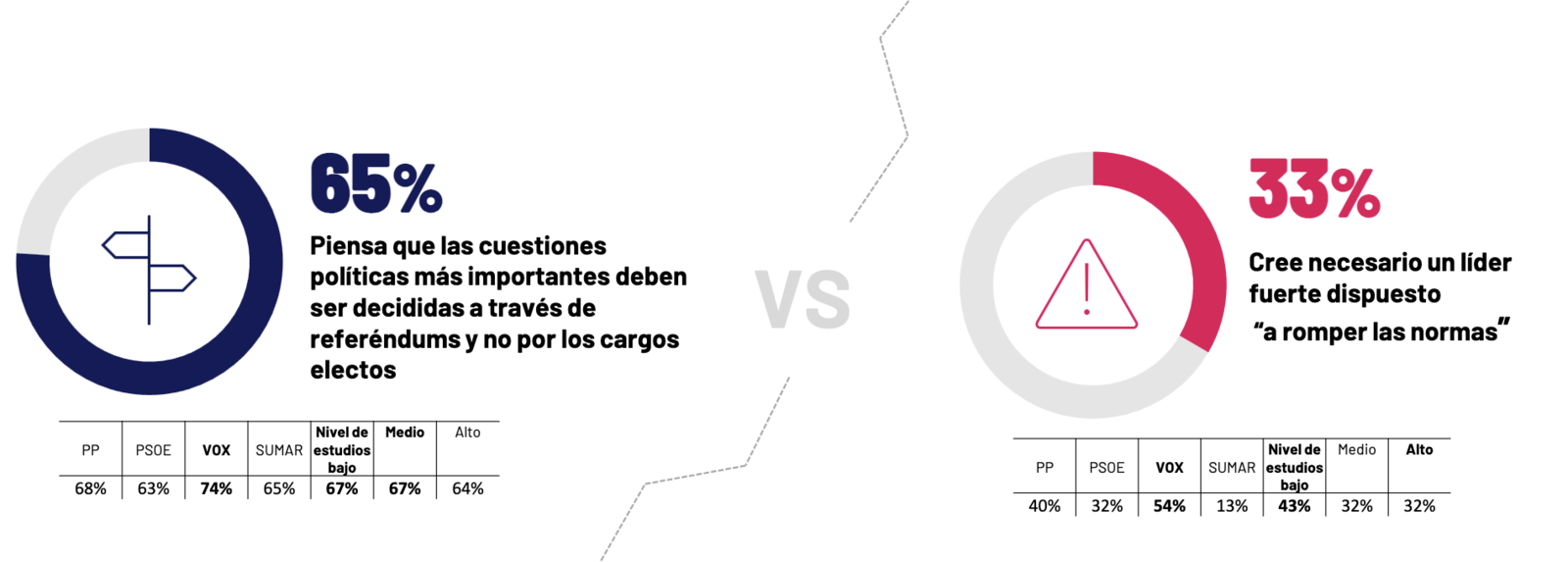 El 65% cree que las cuestiones más importantes de la política deberían decidirse a través de referendos y no por los cargos electos. Del tercio que responde que anhela un líder autoritario, casi la mitad está en el segmento de nivel de formación académica más bajo y es el 54% de los votantes de Vox y 40% de los del PP.